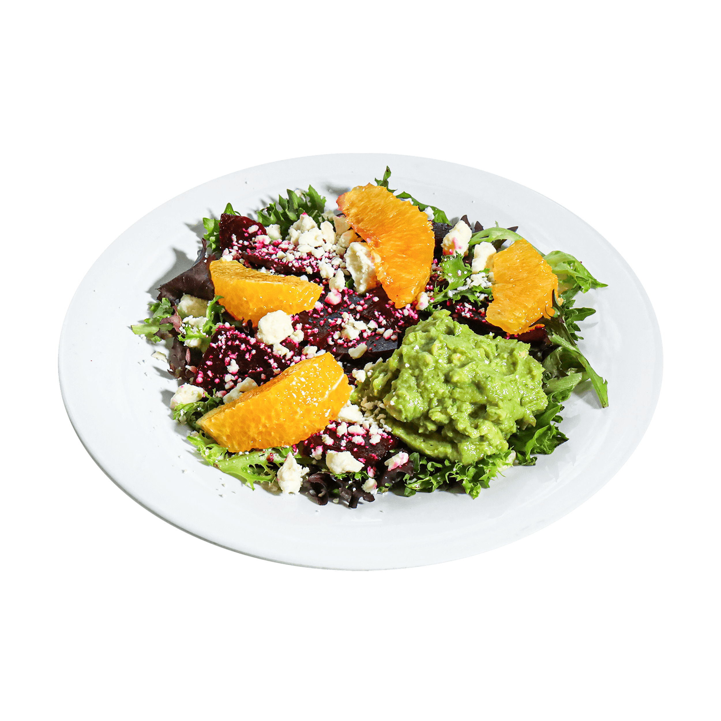Spring mix, herb roasted red beets, feta cheese, toasted nuts & seeds, orange supreme, avocado